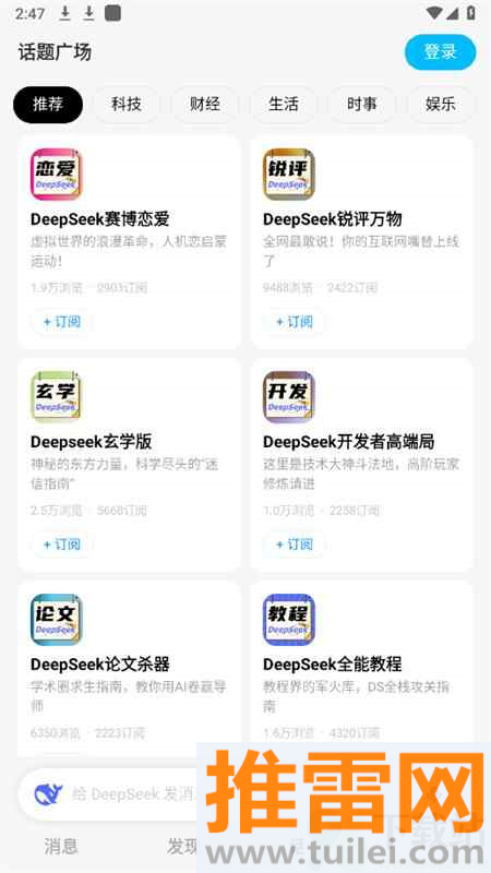 3、点开话题广场能看到各种分类内容,科技财经生活娱乐一类一类排着,滑着看就行,随时能蹭点新知。