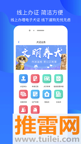 1、它把办狗证、查法规这些官方事务都搬到了线上,让文明养犬这件事变得更简单。
