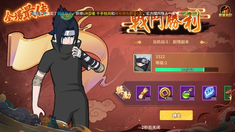 2、新手达成第一个10星忍者即可领取一套红五星装备奖励