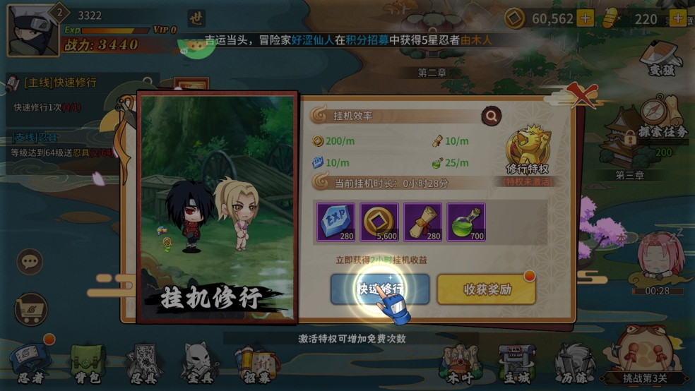 4、主线冒险可提升人物等级,每天至少领取两次离线经验奖励(12h一次)VIP决定了经验的获取多少(快速修行卡等级时再使用)