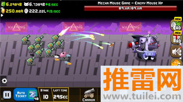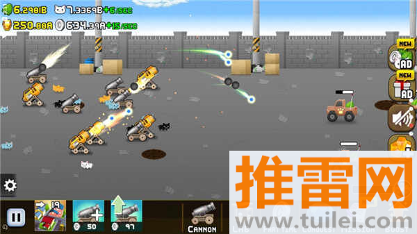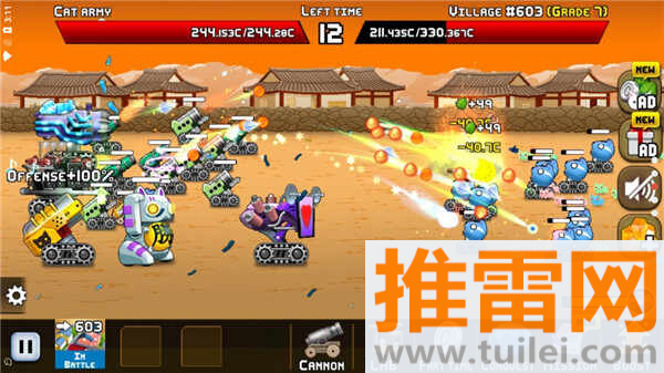 让猫咪打工赚硬币,购买火炮装备,形成赚钱升级的良性循环。