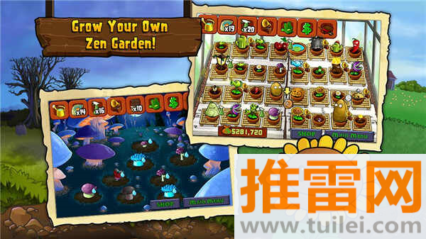 在疯狂打僵尸之余你还可以在禅境花园里种种花浇浇水养出的植物还能帮你赚金币买道具。