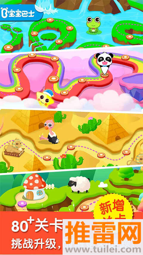 1、游戏内设四大主题,每个主题下有超过十个关卡,总共四十多个超萌的游戏场景,确保孩子每次玩都能找到新鲜感。