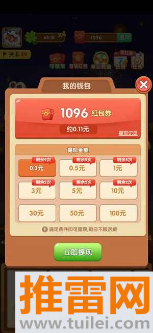 4、通关后自动弹出红包领取窗口,点击“立即领取”存入账户,可在“我的红包”页面查看余额。