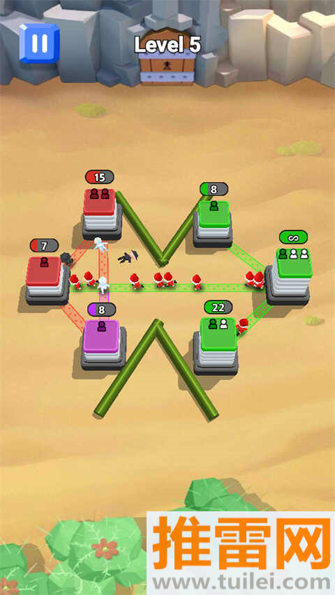 4、遇到有障碍物的地图一定要多绕路,利用同颜色的塔楼互相增援来绕过挡板,千万别在死路上浪费兵力。