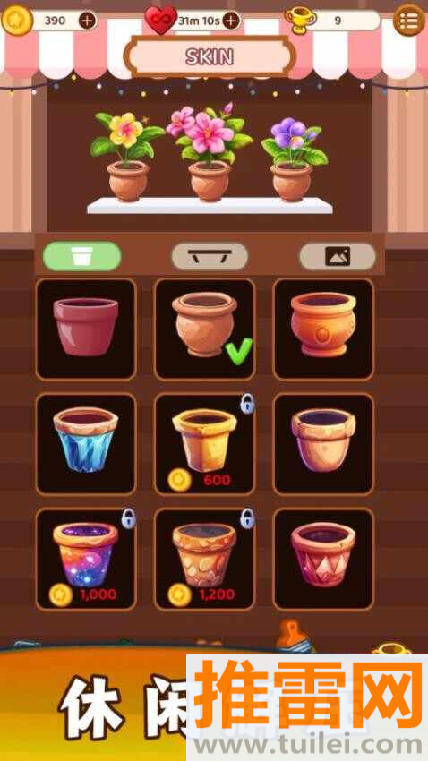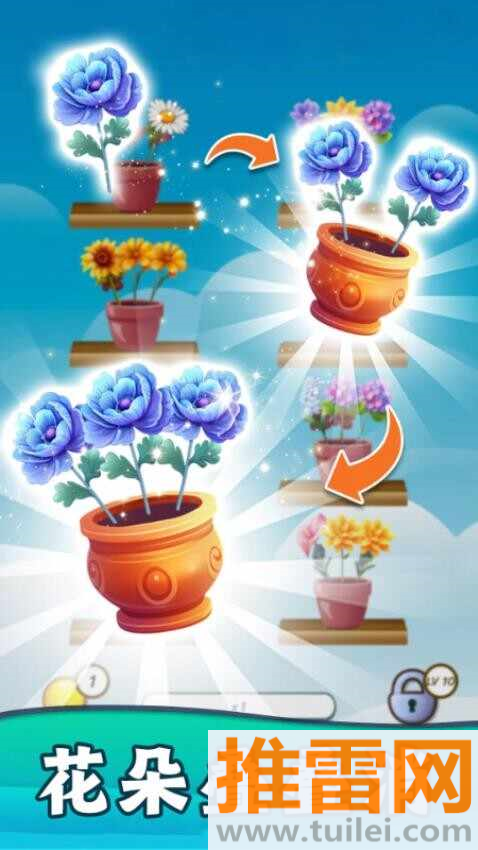 3、每过五关送一次“花园票”,票能换花盆、换土、换种子,种子三小时开花,花开了给你加金币,金币再买道具,循环养老。