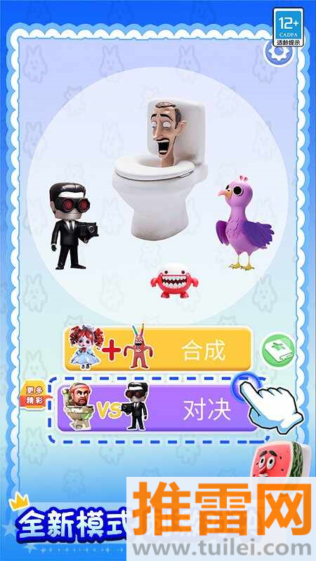 合成大对决是实验室里“瞎鼓捣”合法化,你把马桶人、彩虹人、大熊猫统统扔进一个罐子摇一摇,咣当一声蹦出新物种,战斗力多少全看脸,没有复杂剧情,也不用背技能表,手指一拖一合就能出奇迹,三分钟不来一把手就痒,画风鬼畜又上头,合成结果永远猜不到,上一把刚弄出会喷水的斑马,下一把可能给你整只带电的马桶刷,爽点就在开盲盒。
