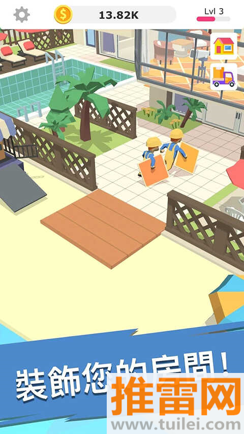 3、铺砖阶段留一个工人别点完成,先让他去把下套房的墙刷了,卡时间差,金币流不会断,升级更快。
