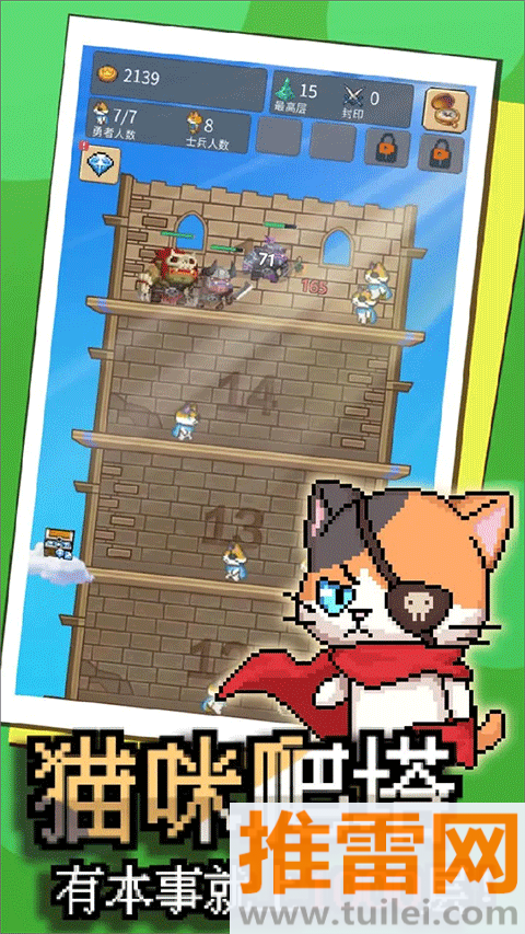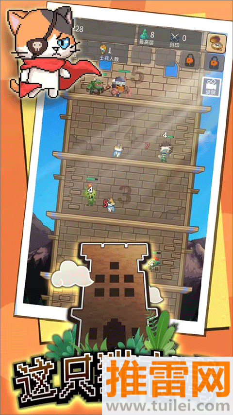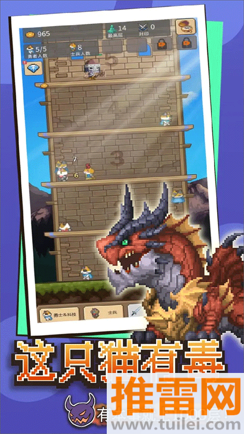 这只猫有毒这游戏,名字听着有点坏,其实是一只穿斗篷的傲娇小猫带着你打怪爬塔救公主,玩法简单到离谱——点哪层楼,就在哪层召唤勇士开打,不用手操、不用走位,全靠兵种搭配和装备堆叠硬刚,从第一层的小喽啰一路干到第1000层的魔王,中间能解锁上百种奇奇怪怪的兵种:会放火的法师猫、扛盾的铁锅兵、骑扫帚的幽灵奶妈……打怪掉金币,金币升科技、换装备、开新兵种,越打越爽,画风软萌但战斗节奏贼上头,适合摸鱼时点两下,也适合肝帝反复刷配装,反正那只猫一直在催:“快点!公主还在等咱呢!”
